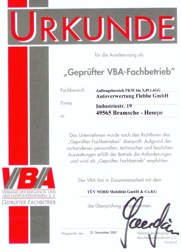 Wir sind ein zertifizierter Altfahrzeugentsorgungsfachbetrieb gemäß § 5 Abs. 3 Altfahrzeug-Verordnung. Nur Betriebe, welche die strengen gesetzlichen Auflagen erfüllen und regelmäßig überprüft werden, erhalten dieses Gütesiegel. Für unsere Kunden bedeutet dies größtmögliche Sicherheit, denn gerade der Abfallerzeuger hat sich vom ordnungsgemäßen Verbleib seiner Abfälle zu überzeugen. Daher sollten Sie Ihre Altautos von vornherein einem Entsorgungsfachbetrieb anvertrauen. |